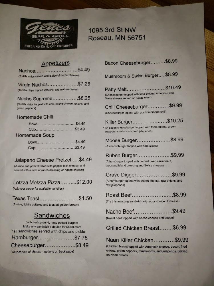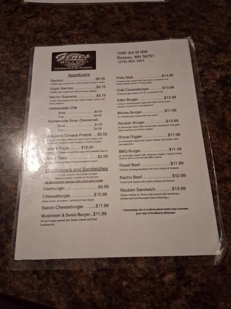 Welcome to Gene's Bar & Grill, your go-to destination in Roseau for a relaxed dining experience! Nestled at 1095 3rd St NW, we offer a cozy atmosphere complete with a fireplace, perfect for enjoying our extensive cocktail menu and selection of local beers. Whether you're here for lunch, dinner, or a casual snack, our menu features traditional, shareable dishes that hit the spot. Take advantage of our outdoor terrace, or order takeout for a night in. With accessible seating and a vibrant ambiance, Gene's is perfect for students, tourists, and groups alike. Join us for unforgettable meals and good times!